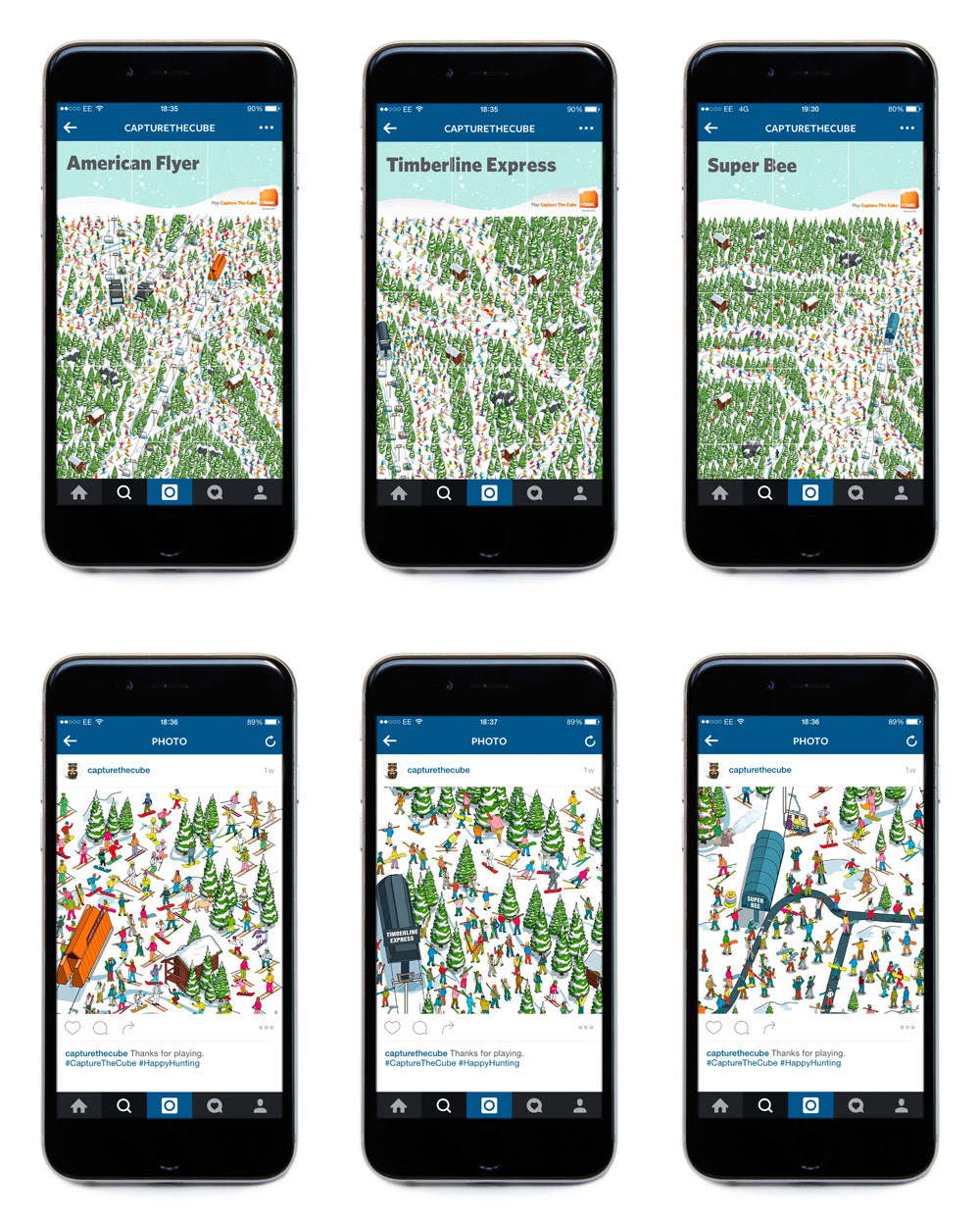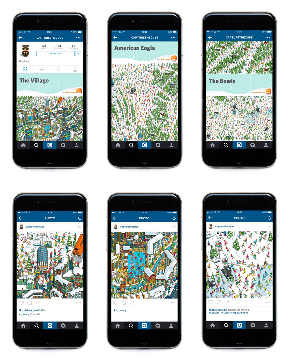 Finding the hidden object or character that matches the clue shows where on the mountain the real cube has been hidden. Then by using the Cube Finder app the compass will point the user in the direction of the hidden cube. Once a cube has been found the winner can then claim their free snowboard or skis at the FirstBank tent in the Village Center.