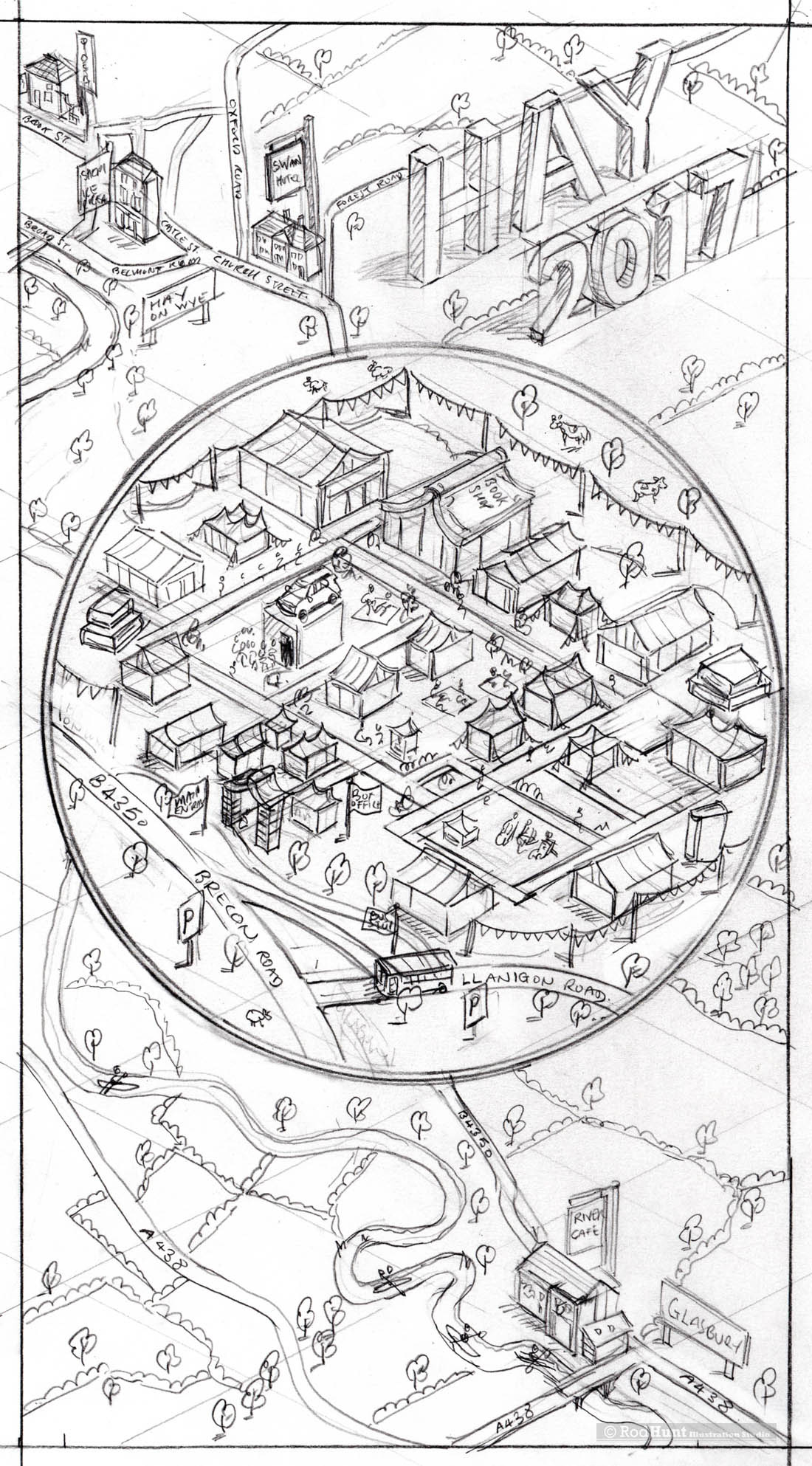 Rod Hunt was commissioned by British GQ to illustrate 'How to Hay, an Insiders Guide', creating a map of the location for their preview of this May's 2017 Hay Literary Festival.