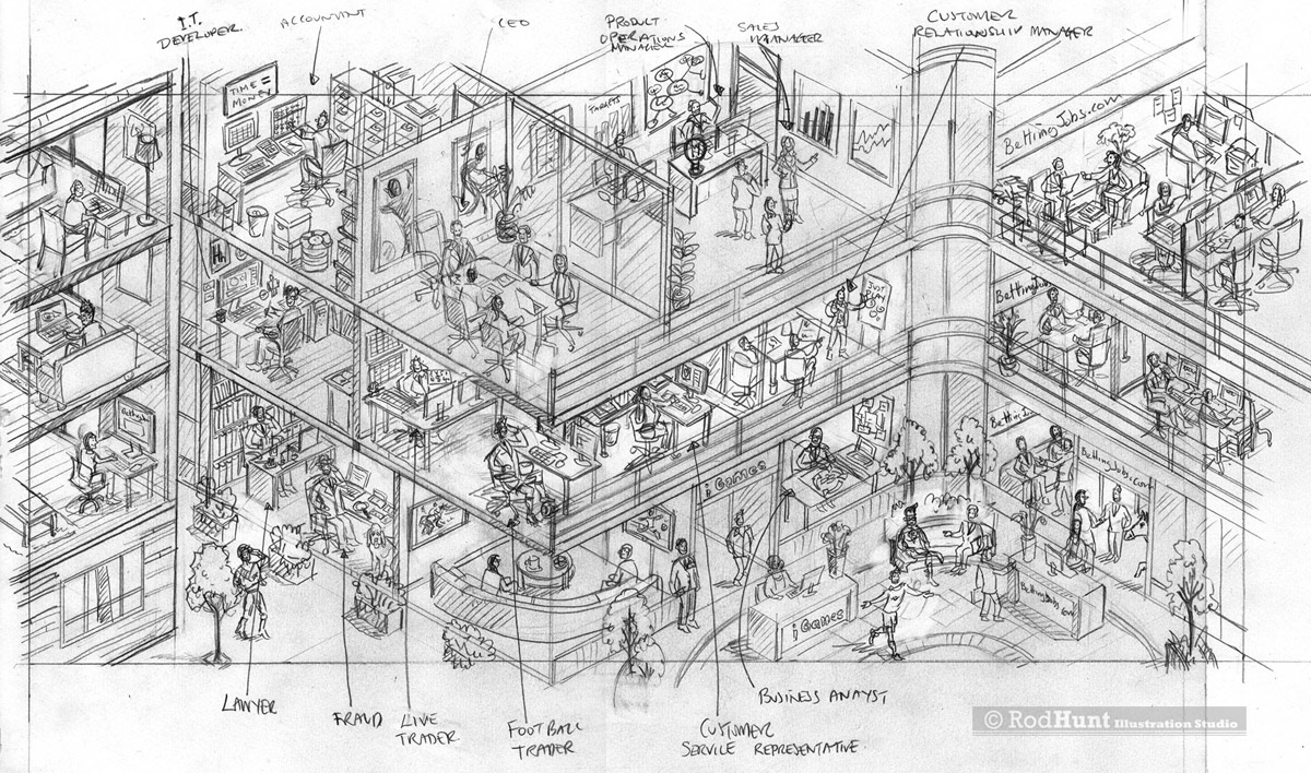 Working with Fission Creative, Rod Hunt provided the illustration for the redesign of the Bettingjobs.com website, a recruitment consultancy specialising in the online gaming and betting industry. The illustration needed to show a cutaway office building with the different jobs and departments inside a Betting business, in a fun and engaging way.