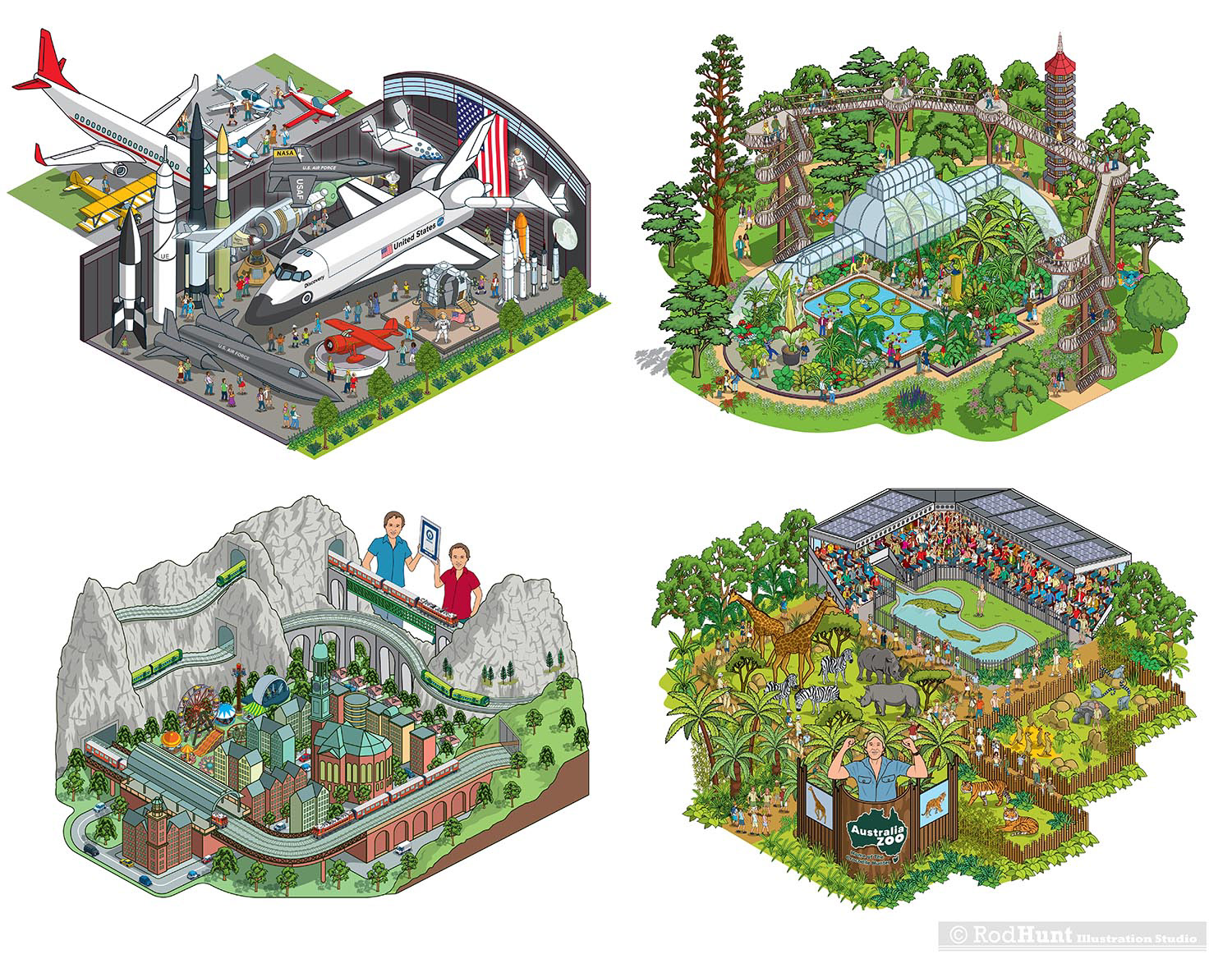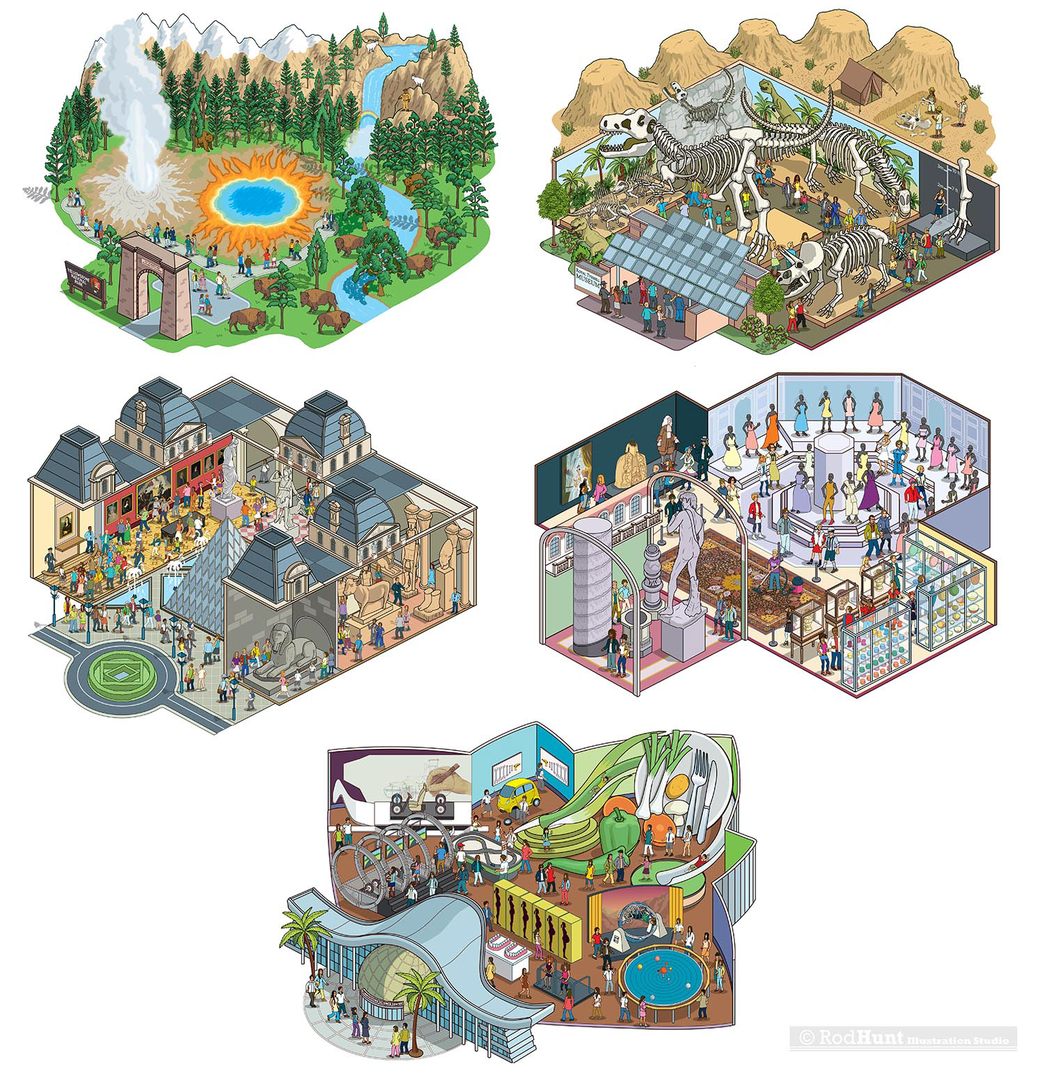Rod Hunt was commissioned by Guinness World Records to create the cover to the 2022 book, continuing their successful partnership. The highly detailed Where's Waldo / Wally? style book cover illustration to this years book shines a spotlight on the environment and the natural world, squeezing in hundreds of record-breaking people, animals and objects a search and find puzzle extravaganza. The 2022 cover seamlessly joins to the 2021 edition creating one huge artwork. Rod also illustrated the Virtual Visits sections inside the book that lead you though nine of the most popular museums, parks and attractions from around the world.
