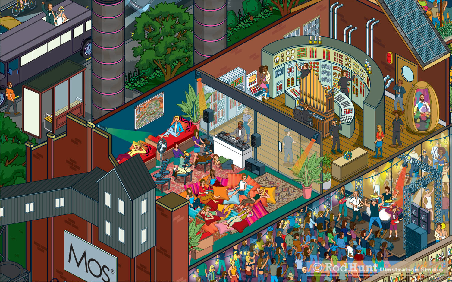 Rod Hunt was commissioned by Australian street furniture design and manufacture company Mos to create the artwork for their annual jigsaw puzzle gift to their clients. This year they wanted to create a busy search and find nightclub party scene to celebrate the company's 10th anniversary. The fictional location for the party is based on iconic historical industrial space the White Bay Power Station in Sydney, showing a cutaway of the interior where the party is taking place.