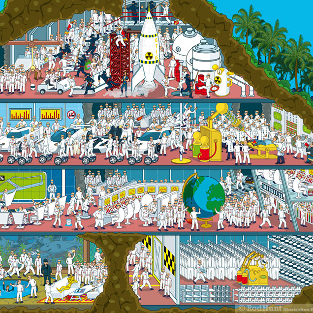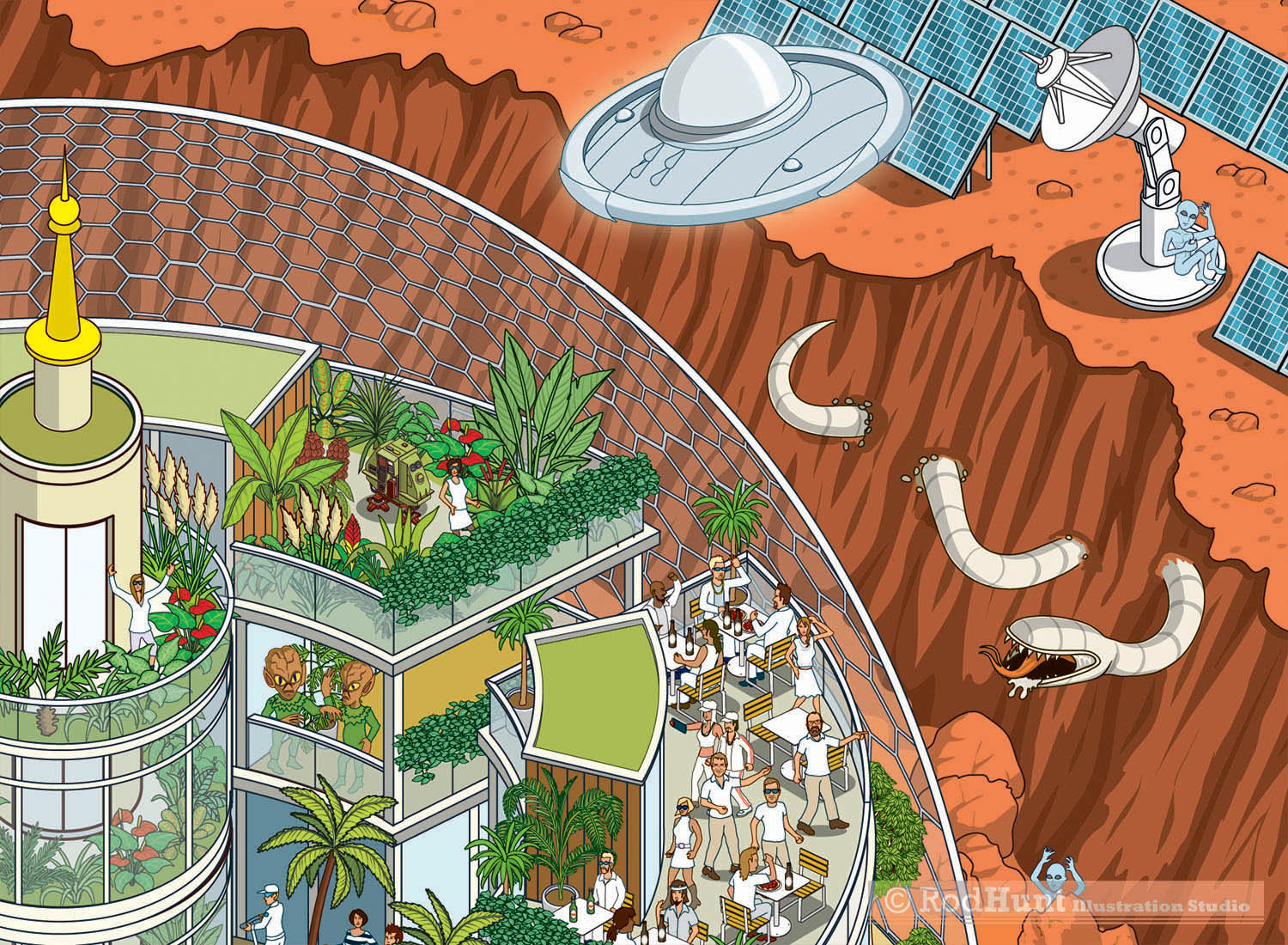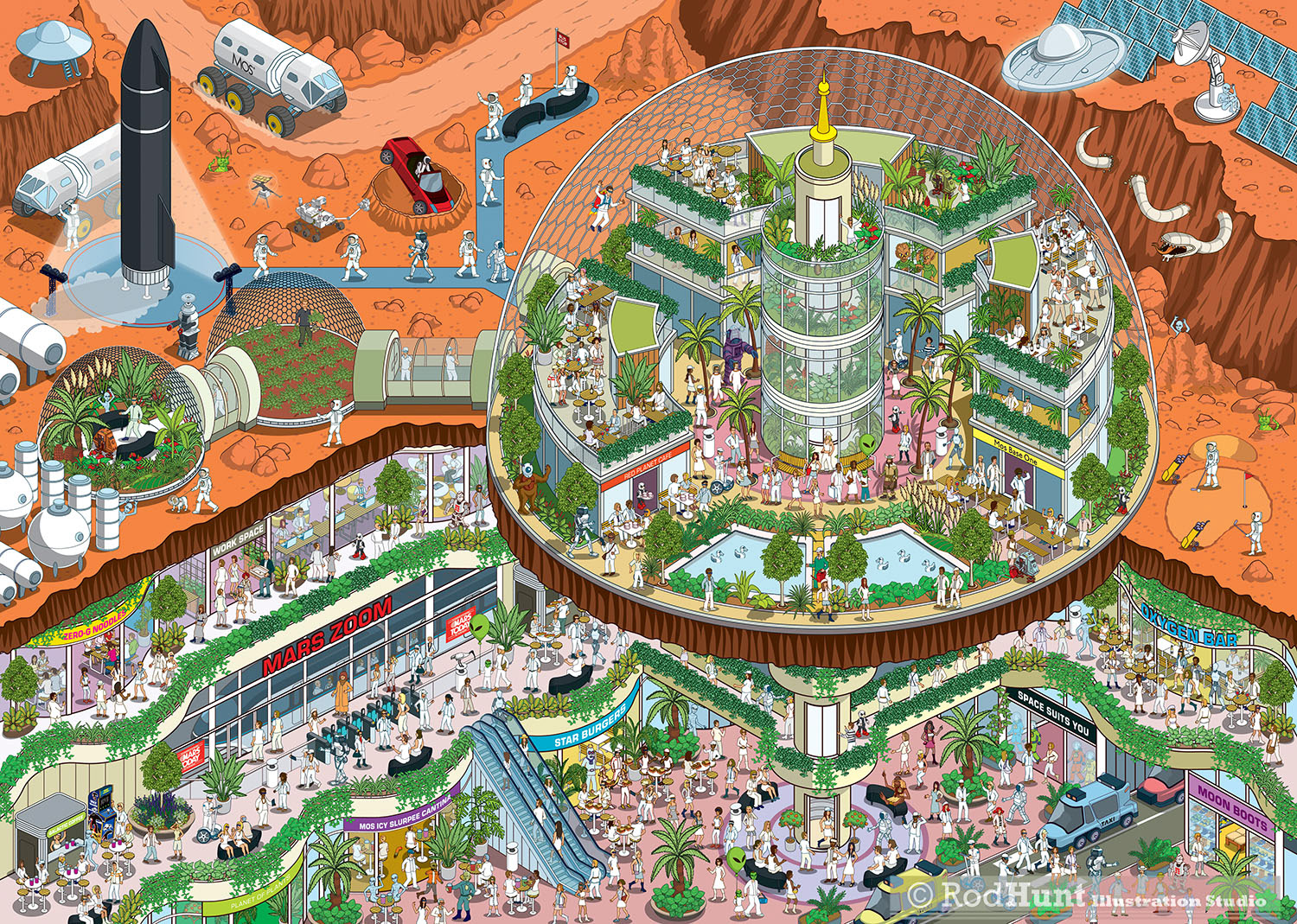 Rod Hunt was commissioned by street furniture design and manufacture company Mos Urban to create a Mars City Colony illustration for their annual client jigsaw puzzle Christmas present. The illustration features some of their furniture ranges across the environments and habitat domes as well as various sci-fi movie references and SpaceX's Starship.