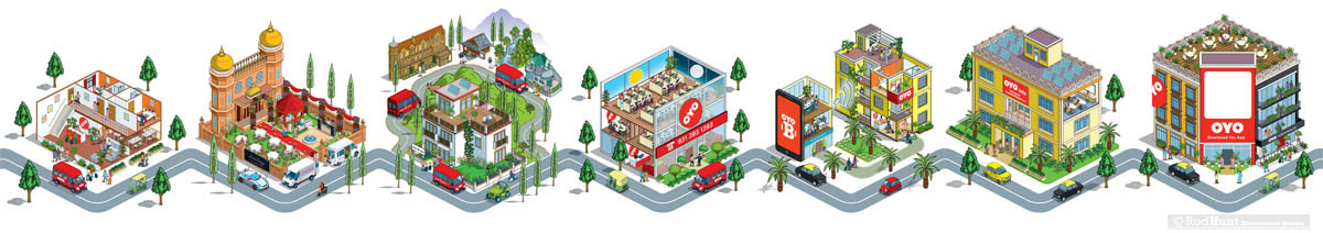 Rod Hunt was commissioned to create illustrations to tell the story of OYO, showcasing the company, it's services and bringing alive their history. Launched in 2013, OYO is India’s largest hospitality company. Its network currently spans over 200 Indian cities including all major metros, regional commercial hubs, leisure destinations, and key pilgrimage towns. It also has an international presence with hotels in Malaysia, Nepal and the UK.