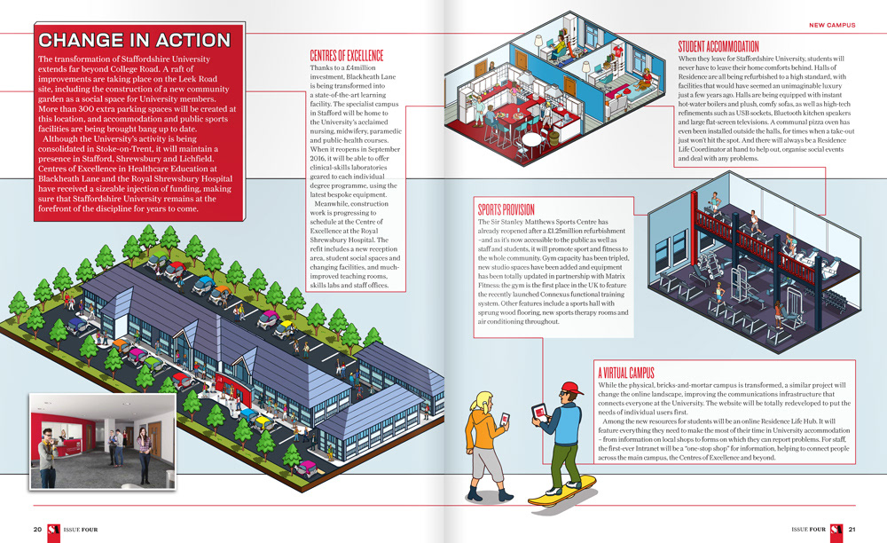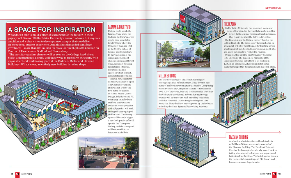 Map artist Rod Hunt was commissioned by RileyRaven to illustrate a campus map for the redevelopment of Staffordshire University's College Road and Blackeath Lane campus' for the SA Alumni Magazine. The main College Road campus visualization focuses on the architectural improvements to the site, the new general teaching building, as as well as the refurbishment of the Cadman, Mellor and Flaxman buildings. Rod used isometric perspective for the map giving a clear structure to the site that showed the redeveloped buildings are areas.